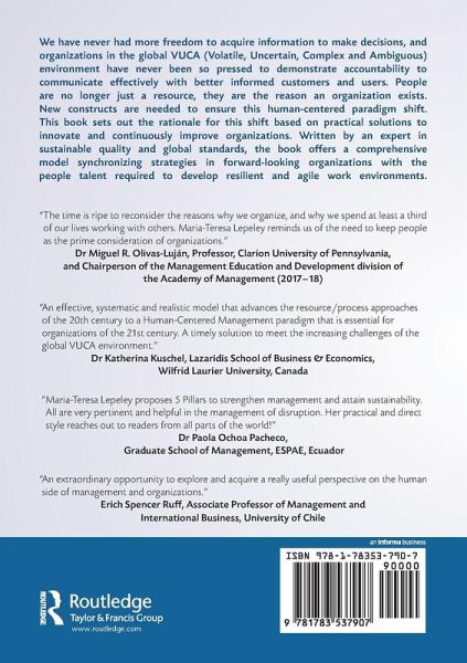 We have never had more freedom to acquire information to make decisions, and organizations have never been so pressed to demonstrate accountability as they communicate with better informed customers and users. People who work IN an organization must also work FOR the organization to accomplish its mission. In this environment, humans are no longer just a resource; they are the reason an organization exists. New constructs are needed to ensure this human-centered paradigm shift.This book sets out the rationale for this shift and stimulates the discussion and the discovery of effective approaches and solutions to innovate for social and environmental good. Written by an expert in quality standards, the book offers a coherent model which synchronizes the organizational structure with the talent required to develop resilient and agile work environments. New strategies to develop talent will be critical, and multidisciplinary approaches from scholars and practitioners from around the world will be required to effectively collaborate and articulate the solutions. The proposition in the book focuses on continuous improvement and interdisciplinary collaboration between scholars and practitioners across different industries, sectors, and national borders in order to address the unavoidable disruptions in the global VUCA environment.