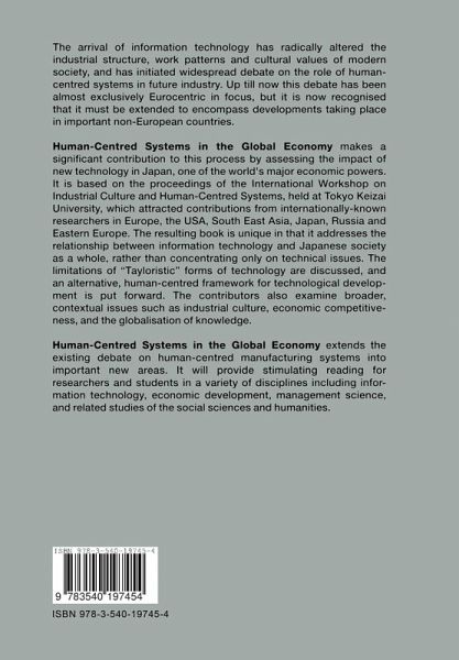The arrival of the information society in Japan has radically altered the industrial structure, work patterns and cultural values of its society. The innovation and implementation of information technology has accelerated this change and made its effects more profoundly felt. Because of this, there is now a need to widen the debate on human-centred manufacturing systems to include broader issues such as industrial culture, international economies and global knowledge. Human Centred Systems in the Global Economy contains the proceedings of an international workshop held at Tokyo Keizai University which looked at the design of human-centred systems in the context of these technological and social changes. The workshop attracted contributions from internationally known researchers in Europe, Japan, the USA, South East Asia, Eastern Europe and the USSR. The resulting volume is unique in that it addresses the relationship of information technology to Japanese society as a whole, rather than concentrating on technical issues. The papers have been divided into three areas, covering the structure, dimensions, and policies and perspectives of the information society. Specific areas covered include: social and cultural shaping of technology, economic interdependence, technology and knowledge transfer, computer-aided design, management culture and communication technologies. Human Centred Systems in the Global Economy provides a comprehensive assessment of the debates on human-centred systems and will be of interest to people in a wide variety of disciplines including information technology, economic development, management science and related studies of social science and humanities.