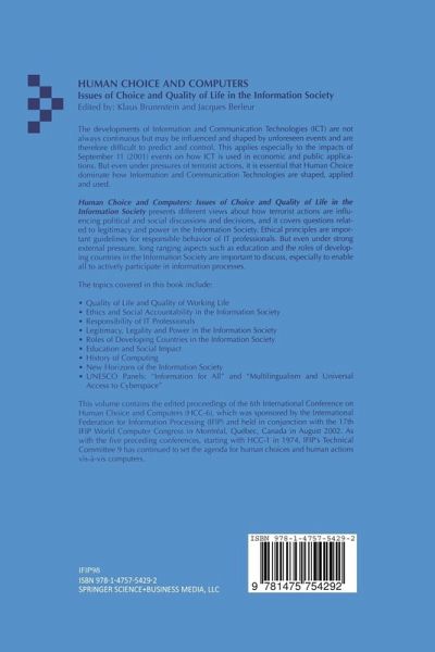 Human Choice and Computers: Issues of Choice and Quality of Life in the Information Society presents different views about how terrorist actions are influencing political and social discussions and decisions, and it covers questions related to legitimacy and power in the Information Society. Ethical principles are important guidelines for responsible behavior of IT professionals. But even under strong external pressure, long ranging aspects such as education and the roles of developing countries in the Information Society are important to discuss, especially to enable all to actively participate in information processes.
