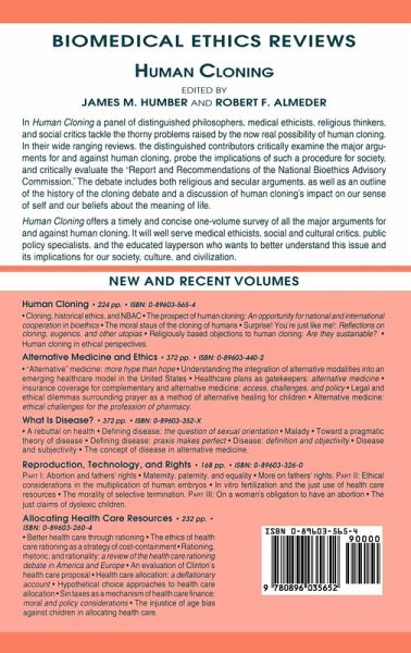 ". . . an interesting and accessible read. . .chapters provide a useful 'springboard' to encourage further debate and a deeper understanding of the issues."-Bulletin of Medical Ethics "By including articles that cover a wide range of analytical perspective and moral positions, this volume provides a good overview of the debate on human cloning. George Annas argues that human cloning should be banned because it "radically alters the very definition of what it is to be be human" Michael Tooley finds it morally acceptable, and points out its potential benefits to society. Jan Hellerargues that the common religious objections against human cloning lack substantive moral support. The other three contributors aim primarily to situate the discussion within a larger historical framework." - Quarterly Review of Biology "A volume in the Biomedical Ethics Review series, this book examines cloning from a number of disciplinary perspectives, including historical, ethical, and religious. In the context of a rapidly burgeoning literature on the topic of cloning and related issues, this addition is welcome in bringing together these different approaches. ...The value of this collection of paper lies at least partly in its reflection on the main themes and trends; partly in its analysis of forms of argument and their applicability to the topic." -International Digest of Health Legislation