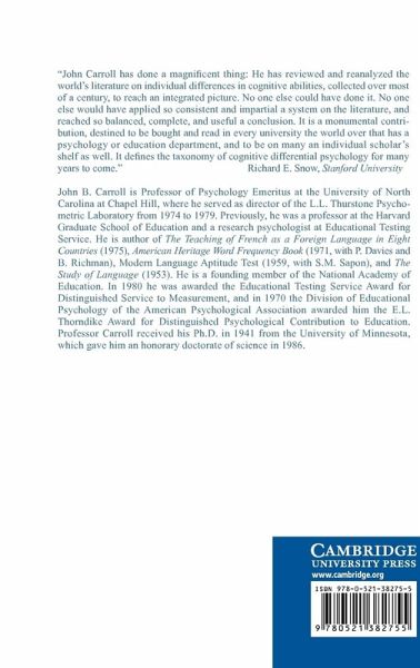 This 1993 work surveys and summarizes the results of more than seventy years of investigation, by factor analysis, of a variety of cognitive abilities, with particular attention to language, thinking, memory, visual and auditory perception, creativity and the production of ideas, and the speed and accuracy of mental processing. The author describes his detailed findings resulting from reanalysis of more than 460 data sets from the factor-analytic literature, followed by a presentation of a hierarchical, three-stratum theory of cognitive ability and its implications for further research. A set of three computer disks (IBM 3-1/2" 1.4 megabytes, ASCII format) containing the numerical data sets and Dr. Carroll's statistical results is also available. Representing over 4 megabytes of data or roughly 2000 printed pages the disks are major resources for the interested researcher.