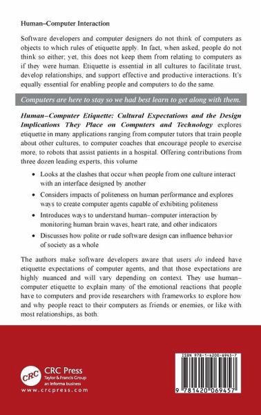 Chapter 1: Human-Computer Etiquette: Should Computers Be Polite? Part I: Etiquette and Multicultural Collisions. Chapter 2: As Human-Computer Interactions Go Global. Chapter 3: Etiquette to Bridge Cultural Faultlines: Cultural Fault lines in Multinational Teams: Potential for Unintended Rudeness. Part II: Introducing Etiquette and Culture into Software. Chapter 4: Computational Models of Etiquette and Culture. Chapter 5: The Role of Politeness in Interactive Educational Software for Language Tutoring. Chapter 6: Designing for Other Cultures: Learning Tools Design in the Nasa Amerindian Context. Part III: Etiquette and Development of Trust. Chapter 7: Network Operations: Developing Trust in Human and Computer Agents. Chapter 8: Etiquette in Distributed Game-Based Training: Communication, Trust, Cohesion. Part IV: Anthropomorphism: Computer Agents that Look or Act Like People. Chapter 9: Etiquette in Motivational Agents: Engaging Users and Developing Relationships. Chapter 10: Anthropomorphism and Social Robots: Se tting Etiquette Expectations. Part V: Understanding Humans: Physiological and Neurological Indicators. Chapter 11: The Social Brain: Behavioral, Computational, and Neuroergonomic Perspectives. Chapter 12: Etiquette Considerations for Adaptive Systems that Interrupt: Cost and Benefits. Part VI: The Future: Polite and Rude Computers as Agents of Social Change. Chapter 13: Etiquette-Based Sociotechnical Design. Chapter 14: Politechnology: Manners Maketh Machine. Chapter 15: Epilogue. Index.