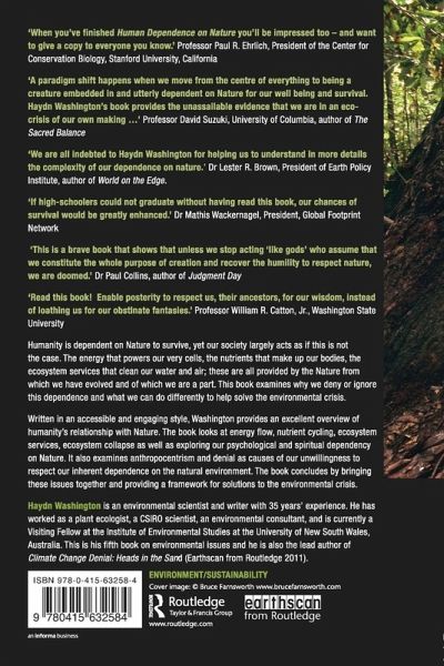 Humanity is dependent on Nature to survive, yet our society largely acts as if this is not the case. The energy that powers our very cells, the nutrients that make up our bodies, the ecosystem services that clean our water and air; these are all provided by the Nature from which we have evolved and of which we are a part. This book examines why we deny or ignore this dependence and what we can do differently to help solve the environmental crisis. Written in an accessible and engaging style, Haydn Washington provides an excellent overview of humanity's relationship with Nature. The book looks at energy flow, nutrient cycling, ecosystem services, ecosystem collapse as well as exploring our psychological and spiritual dependency on nature. It also examines anthropocentrism and denial as causes of our unwillingness to respect our inherent dependence on the natural environment. The book concludes by bringing these issues together and providing a framework for solutions to the environmental crisis.