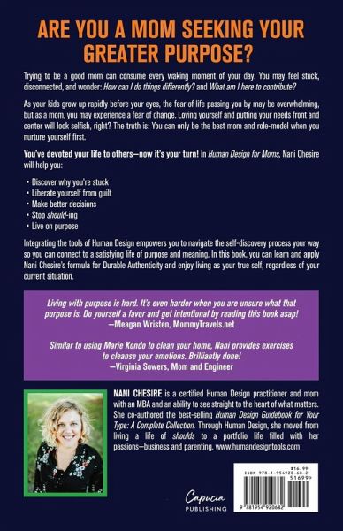 Are You a Mom Seeking Your Greater Purpose? Trying to be a good mom can consume every waking moment of your day. You may feel stuck, disconnected, and wonder: How can I do things differently? and What am I here to contribute? As your kids grow up rapidly before your eyes, the fear of life passing you by may be overwhelming, but as a mom, you may experience a fear of change. Loving yourself and putting your needs front and center will look selfish, right? The truth is: You can only be the best mom and role-model when you nurture yourself first. You've devoted your life to others-now it's your turn! In Human Design for Moms, Nani Chesire will help you: Discover why you're stuck Liberate yourself from guilt Make better decisions Stop should-ing Live on purpose Integrating the tools of Human Design empowers you to navigate the self-discovery process your way so you can connect to a satisfying life of purpose and meaning. In this book, you can learn and apply Nani Chesire's formula for Durable Authenticity and enjoy living as your true self, regardless of your current situation.