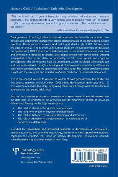 Data generated from longitudinal studies allow researchers to better understand how context and experience interact with stable characteristics of the developing person over time. This book summarizes a landmark longitudinal study of 200 children, from the ages of 3 to 23. The Munich Longitudinal Study on the Ontogenesis of Individual Competencies (LOGIC) examined the development of individual differences over time and whether it is possible to predict later competencies from earlier ones. Offering a snapshot of theory and data on personality, social, motor, moral, and cognitive development, the contributors help us understand which individual differences can and cannot be altered through schooling and other experiences and how differences seen in the earliest stages are later reflected in adulthood. The results provide valuable insight into the strengths and limitations of early prediction of individual differences. This is the second volume to review the wealth of data generated by the study. The first volume (Weinert and Schneider, 1999) traced development from ages 3 to 12. This volume continues the story, integrating these early findings with the results from adolescence and young adulthood. Each of the chapters provides an overview of current research and addresses how the data help us understand the presence and developmental effects of individual differences. Among the findings are results on: The relative stability of cognitive competencies The long term effects of shyness and aggression The relation between moral understanding and action, and The role of education in the development or maintenance of performance differences. Intended for researchers and advanced students in developmental, educational, personality, social, and cognitive psychology, this book will also appeal to educators, especially the chapters that focus on literacy development, educational context, scientific reasoning and mathematical reasoning.