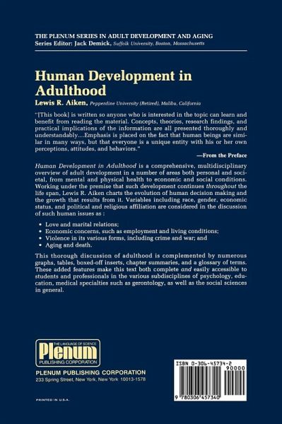 Human Development in Adulthood is a comprehensive, multidisciplinary overview of adult development in a number of areas both personal and societal, from mental and physical health, to economic and social conditions. Variables including race, gender, economic status, and political and religious affiliation are considered in the discussion of such human issues as - love and marital relations - economic concerns, including employment and living conditions - violence in its various forms, including crime and war - aging and death.