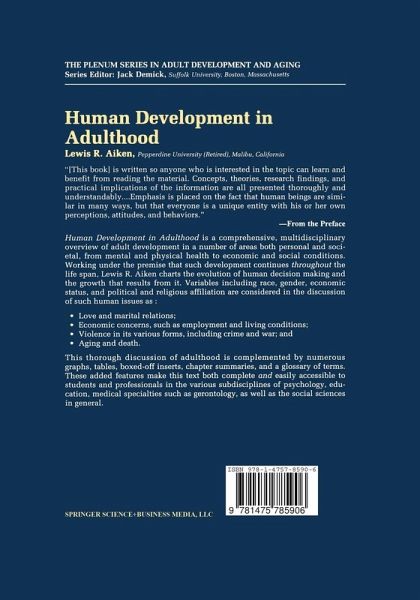 Human Development in Adulthood is a comprehensive, multidisciplinary overview of adult development in a number of areas both personal and societal, from mental and physical health, to economic and social conditions. Variables including race, gender, economic status, and political and religious affiliation are considered in the discussion of such human issues as - love and marital relations - economic concerns, including employment and living conditions - violence in its various forms, including crime and war - aging and death.