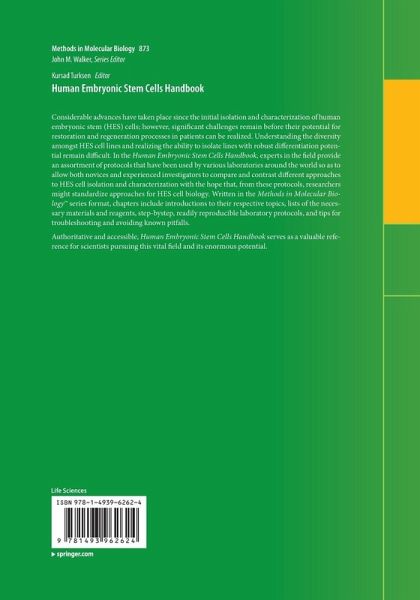 Considerable advances have taken place since the initial isolation and characterization of human embryonic stem (HES) cells; however, significant challenges remain before their potential for restoration and regeneration processes in patients can be realized. Understanding the diversity amongst HES cell lines and realizing the ability to isolate lines with robust differentiation potential remain difficult. In the Human Embryonic Stem Cells Handbook, experts in the field provide an assortment of protocols that have been used by various laboratories around the world so as to allow both novices and experienced investigators to compare and contrast different approaches to HES cell isolation and characterization with the hope that, from these protocols, researchers might standardize approaches for HES cell biology. Written in the Methods in Molecular Biology(TM) series format, chapters include introductions to their respective topics, lists of the necessary materials and reagents, step-by-step, readily reproducible laboratory protocols, and tips for troubleshooting and avoiding known pitfalls.