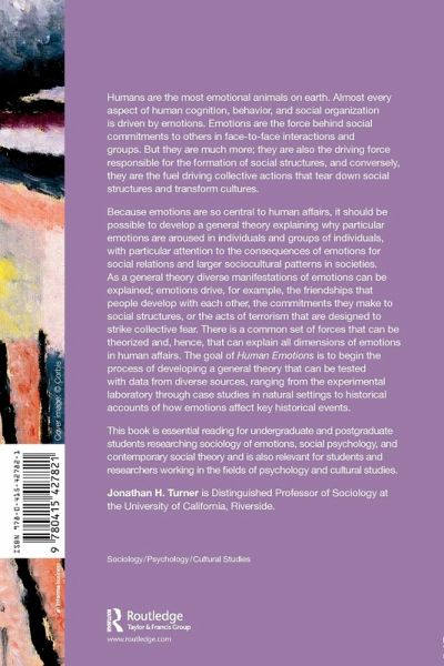 This major theoretical work takes existing work on the emotions in significantly new directions. It gives a comprehensive account of emotions, beginning with general sociological principles, moving over important theory construction of social formation and applying this to a detailed and unified 'grand' theory of human emotions. Presenting a unified view of the emotions in the social universe, the book explores the relationships between emotions, social structure, and culture. Turner hypotheses how social structure and culture affect emotional arousal in humans, and vice versa. This book is essential reading for undergraduate and postgraduate students researching sociology of emotions, social psychology, and contemporary social theory, and is also relevant for students and researchers working in the fields of psychology and cultural studies.