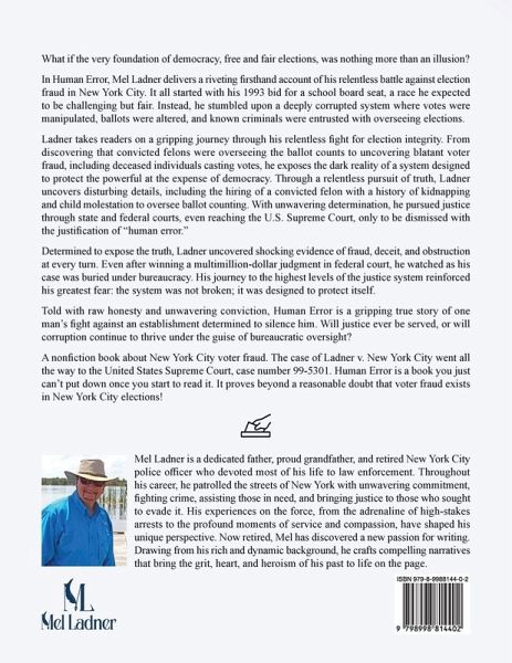 Synopsis: What if the very foundation of democracy, free and fair elections, was nothing more than an illusion? In Human Error, Mel Ladner delivers a riveting firsthand account of his relentless battle against election fraud in New York City. It all started with his 1993 bid for a school board seat, a race he expected to be challenging but fair. Instead, he stumbled upon a deeply corrupted system where votes were manipulated, ballots were altered, and known criminals were entrusted with overseeing elections. Ladner takes readers on a gripping journey through his relentless fight for election integrity. From discovering that convicted felons were overseeing the ballot counts to uncovering blatant voter fraud, including deceased individuals casting votes, he exposes the dark reality of a system designed to protect the powerful at the expense of democracy. Through a relentless pursuit of truth, Ladner uncovers disturbing details, including the hiring of a convicted felon with a history of kidnapping and child molestation to oversee ballot counting. With unwavering determination, he pursued justice through state and federal courts, even reaching the U.S. Supreme Court, only to be dismissed with the justification of "human error." Determined to expose the truth, Ladner uncovered shocking evidence of fraud, deceit, and obstruction at every turn. Even after winning a multimillion-dollar judgment in federal court, he watched as his case was buried under bureaucracy. His journey to the highest levels of the justice system reinforced his greatest fear: the system was not broken; it was designed to protect itself. Told with raw honesty and unwavering conviction, Human Error is a gripping true story of one man's fight against an establishment determined to silence him. Will justice ever be served, or will corruption continue to thrive under the guise of bureaucratic oversight? A nonfiction book about New York City voter fraud. The case of Ladner v. New York City went all the way to the United States Supreme Court, case number 99-5301. Human Error is a book you just can't put down once you start to read it. It proves beyond a reasonable doubt that voter fraud exists in New York City elections! Autobiography: Mel Ladner is a dedicated father, proud grandfather, and retired New York City police officer who devoted most of his life to law enforcement. Throughout his career, he patrolled the streets of New York with unwavering commitment, fighting crime, assisting those in need, and bringing justice to those who sought to evade it. His experiences on the force, from the adrenaline of high-stakes arrests to the profound moments of service and compassion, have shaped his unique perspective. Now retired, Mel has discovered a new passion for writing. Drawing from his rich and dynamic background, he crafts compelling narratives that bring the grit, heart, and heroism of his past to life on the page.