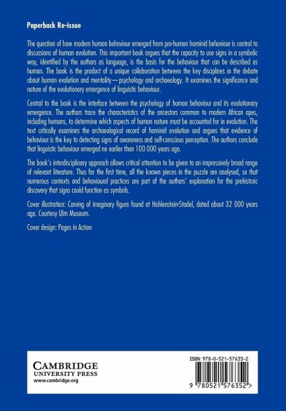 The question of how modern human behaviour emerged from pre-human hominid behaviour is central to discussions of human evolution. This important book argues that the capacity to use signs in a symbolic way, identified by the authors as language, is the basis for behaviour that can be described as human. The book is the product of a unique collaboration between the key disciplines in the debate about human evolution and mentality - psychology and archaeology. It investigates the significance and nature of the emergence of linguistic behaviour. The text critically examines the archaeological record of hominid evolution and argues that linguistic behaviour emerged no earlier than 100,000 years ago. The book's interdisciplinary approach allows critical attention to be given to an impressively broad range of relevant literature. For the first time, all the known pieces of this evolutionary puzzle are examined in detail.