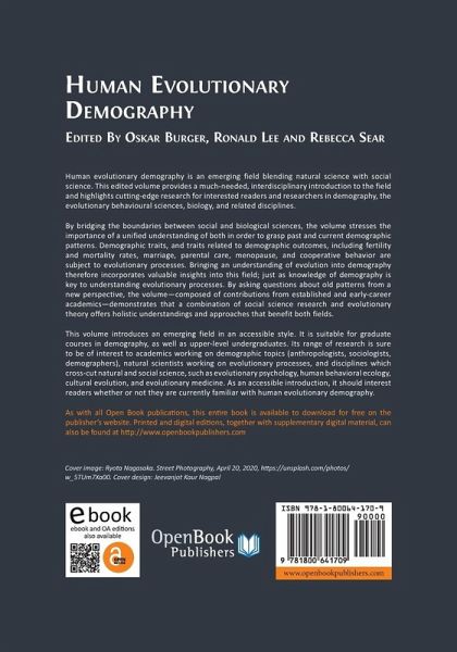 Human evolutionary demography is an emerging field blending natural science with social science. This edited volume provides a much-needed, interdisciplinary introduction to the field and highlights cutting-edge research for interested readers and researchers in demography, the evolutionary behavioural sciences, biology, and related disciplines. By bridging the boundaries between social and biological sciences, the volume stresses the importance of a unified understanding of both in order to grasp past and current demographic patterns. Demographic traits, and traits related to demographic outcomes, including fertility and mortality rates, marriage, parental care, menopause, and cooperative behavior are subject to evolutionary processes. Bringing an understanding of evolution into demography therefore incorporates valuable insights into this field; just as knowledge of demography is key to understanding evolutionary processes. By asking questions about old patterns from a new perspective, the volume-composed of contributions from established and early-career academics-demonstrates that a combination of social science research and evolutionary theory offers holistic understandings and approaches that benefit both fields. Human Evolutionary Demography introduces an emerging field in an accessible style. It is suitable for graduate courses in demography, as well as upper-level undergraduates. Its range of research is sure to be of interest to academics working on demographic topics (anthropologists, sociologists, demographers), natural scientists working on evolutionary processes, and disciplines which cross-cut natural and social science, such as evolutionary psychology, human behavioral ecology, cultural evolution, and evolutionary medicine. As an accessible introduction, it should interest readers whether or not they are currently familiar with human evolutionary demography.