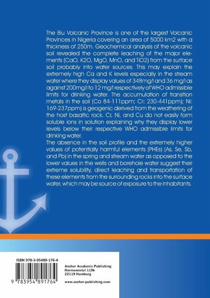 The Biu Volcanic Province is one of the largest Volcanic Provinces in Nigeria covering an area of 5000 km2 with a thickness of 250m. Geochemical analysis of the volcanic soil revealed the complete leaching of the major elements (CaO, K2O, MgO, MnO, and TiO2) from the surface soil probably into water sources. This may explain the extremely high Ca and K levels especially in the stream water where they display values of 348mg/l and 36 mg/l as against 200mg/l to 12 mg/l respectively of WHO admissible limits for drinking water. The accumulation of transition metals in the soil (Co 84-111ppm; Cr: 230-441ppm); Ni: 169-237ppm) is geogenic derived from the weathering of the host basaltic rock. Cr, Ni, and Cu do not easily form soluble ions in solution explaining why they display lower levels below their respective WHO admissible limits for drinking water. The absence in the soil profile and the extremely higher values of potentially harmful elements (PHEs) (As, Se, Sb, and Pb) in the spring and stream water as opposed to the lower values in the wells and borehole water suggest their extreme solubility, direct leaching and transportation of these elements from the surrounding rocks into the surface water, which may be source of exposure to the inhabitants.