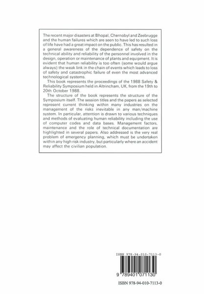 Human Factors in Safety.- Human Factors in the Process Industries.- Human Factors Considerations in the Safety Case for the Channel Tunnel Project.- Safety and Human Factors in Manned Space Flight Systems.- The Role of Technical Documentation for Maintenance Staff in the Safe Operation and Maintenance of Machine and Processes.- Allocation of Function Between Man and Programmable Electronic Systems in Safety-Related Applications.- Human Reliability Assessment.- Human Reliability Assessors Guide: An Overview.- A Comparative Evaluation of Five Human Reliability Assessment Techniques.- Human Factors Reliability Benchmark Exercise, Report of the SRD Participation.- The Application of the Combined THERP/HCR Model in Human Reliability Assessment.- A Practical Application of Quantified Risk Analysis.- PROF a Computer Code for Prediction of Operator Failure Rate.- New Directions in Qualitative Modelling.- Human Factors in Management and Design.- Management Factors and System Safety.- Addressing Human Factors Issues in the Safe Design and Operation of Computer Controlled Process Systems.- Management in High Risk Industries.- Processor-Based Displays: The Flexible Control Panel.- A Human Factors Data-Base to Influence Safety and Reliability.- Decision Support Systems.- Modelling the Evacuation of the Public in the Event of Toxic Releases: A Decision Support Tool and Aid for Emergency Planning.- Designing Decision Support Systems for Human Error Reduction: The Need to Address Information Distortion.- Supporting Expert Judgement of Human Performance and Reliability.