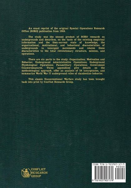 An exact reprint of the original Special Operations Research Office (SORO) publication from 1966. The study was the second product of SORO research on undergrounds and describes, on the basis of the existing empirical information and the then-current state of knowledge, the organizational, motivational, and behavioral characteristics of undergrounds in insurgent movements and relates these characteristics to the total revolutionary structure, mission, and operations. There are six parts to the study: Organization; Motivation and Behavior; Underground Administrative Operations; Underground Psychological Operations; Paramilitary Operations; Government Countermeasures. Three appendices give details on the methodological approach, offer an analysis of 24 insurgencies, and summarize World War II underground rules of clandestine behavior. This classic Unconventional Warfare study has been brought back into print by Conflict Research Group.