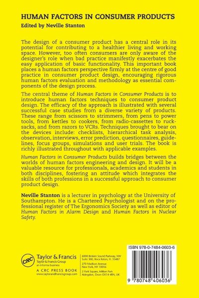 The design of consumer products has a central role in its potential for contributing to a healthier living and working space. However, too often consumers are only aware of the designers' role when bad practice manifestly exacerbates the easy application of basic functionality. This important book places human factors perspective firmly at the centre of good practice in consumer product design, encouraging rigorous human factors evaluation and methodology as an essential component of the design process. The book's central theme is to introduce human factors techniques to consumer product design and the efficacy of the approach is illustrated with several case studies from a diverse variety of products. Products addressed range from scissors to strimers, from pens to power tools, from kettles to cookers, from radio-cassettes to rucksacks, adn from razors to VCRs. Techniques brought to bear on the devices include: checklists, hierarchical task analysis, observations, interviews, error prediction, questionnaires, guidelines, focus groups, simulations and user trials. Key Features: * Foreword by Sean Blair of the Design Council * Valuable resource for professionals, academics and students in both human factors engineering and design * Fosters an approach which integrates the skills of both professions in a successful approach to consumer product design * Includes plenty of examples throughout the book
