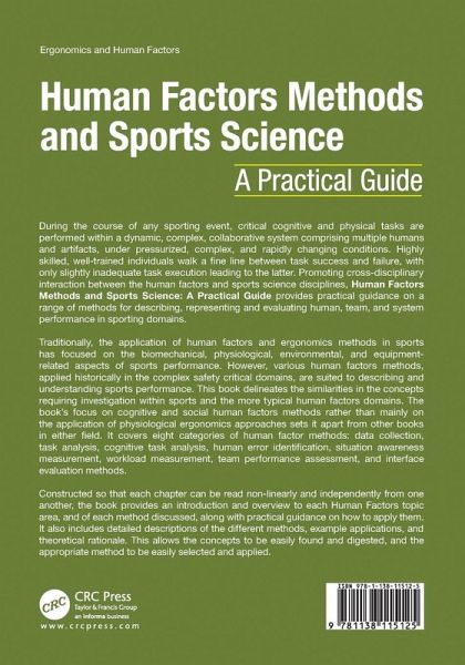 During the course of any sporting event, critical cognitive and physical tasks are performed within a dynamic, complex, collaborative system comprising multiple humans and artifacts, under pressurized, complex, and rapidly changing conditions. Highly skilled, well-trained individuals walk a fine line between task success and failure, with only slightly inadequate task execution leading to the latter. Promoting cross-disciplinary interaction between the human factors and sports science disciplines, Human Factors Methods and Sports Science: A Practical Guide provides practical guidance on a range of methods for describing, representing, and evaluating human, team, and system performance in sports domains. Traditionally, the application of human factors and ergonomics methods in sports has focused on the biomechanical, physiological, environmental, and equipment-related aspects of sports performance. However, various human factors methods, applied historically in the complex safety critical domains, are suited to describing and understanding sports performance. This book delineates the similarities in the concepts requiring investigation within sports and the more typical human factors domains. The book's focus on cognitive and social human factors methods rather than mainly on the application of physiological ergonomics approaches sets it apart from other books in either field. It covers eight categories of human factor methods: data collection, task analysis, cognitive task analysis, human error identification, situation awareness measurement, workload measurement, team performance assessment, and interface evaluation methods. Constructed so that each chapter can be read non-linearly and independently from one another, the book provides an introduction and overview to each Human Factors topic area, and of each method discussed, along with practical guidance on how to apply them. It also includes detailed descriptions of the different methods, example applications, and theoretical rationale. This allows the concepts to be easily found and digested, and the appropriate method to be easily selected and applied.