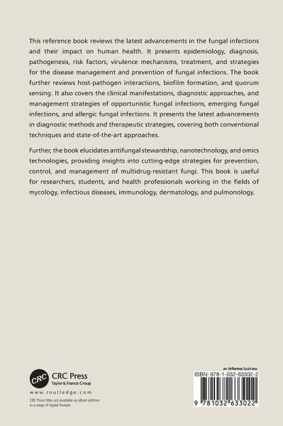 This book reviews the latest advancements in the fungal infections and their impact on human health. It presents epidemiology, diagnosis, pathogenesis, risk factors, virulence mechanisms, and treatment strategies against fungal infections. This book is useful for researchers and students of mycology, dermatology, and pulmonology.