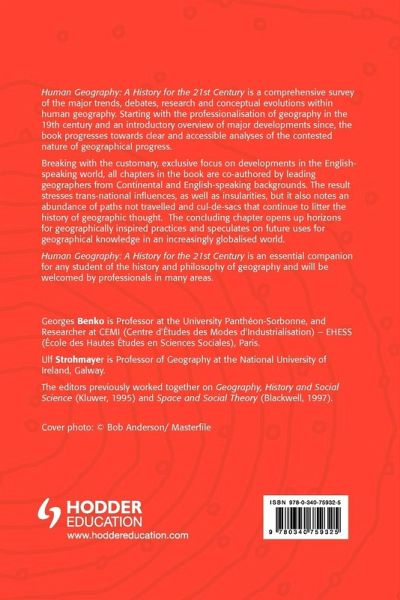 Preface Chapter 1: Geographical Visions: the Evolution of Human Geographic Thought in the 20th Century by Peter Gould (Penn State) and Ulf Strohmayer (NUI, Galway) Chapter 2: Cultural Geography: place and landscape between continuity and change by Paul Claval (Paris-IV) and J. Nicholas Entrikin (UCLA) Chapter 3: Economic Geography: towards the Century of Globalisation by Georges Benko (Paris-I) and Allen J Scott (UCLA) Chapter 4: Historical Geography: Locating Time in the Spaces of Modernity by Mark Bassin (UCL) and Vincent Berdoulay (Pau) Chapter 5: Political Geography: Spaces Between War and Peace by Peter J Taylor (Loughborough) and Herman van der Wusten (Amsterdam) Chapter 6: Social Geography: Looking for Society in its Spaces by Chris Philo (Glasgow) and Ola Söderström (Neuchâtel) Conclusion