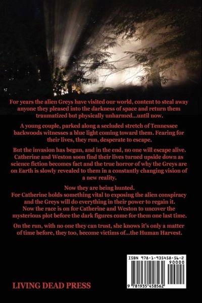 For years the alien Greys have visited our world, content to steal away anyone they pleased into the darkness of space and return them traumatized but physically unharmed...until now. A young couple, parked along a secluded stretch of Tennessee backwoods witnesses a blue light coming toward them. Fearing for their lives, they run, desperate to escape. But the invasion has begun, and in the end, no one will escape alive. Catherine and Weston soon find their lives turned upside down as science fiction becomes fact and the true horror of why the Greys are on Earth is slowly revealed to them in a constantly changing vision of a new reality. Now they are being hunted. For Catherine holds something vital to exposing the alien conspiracy and the Greys will do everything in their power to regain it. Now the race is on for Catherine and Weston to uncover the mysterious plot before the dark figures come for them one last time. On the run, with no one they can trust, she knows it's only a matter of time before, they too, become victims of...the Human Harvest.