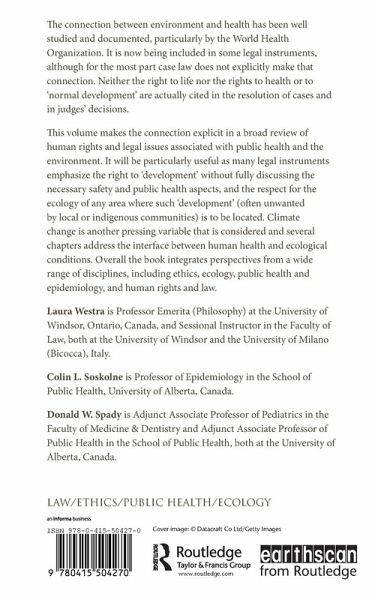 The connection between environment and health has been well studied and documented, particularly by the World Health Organization. It is now being included in some legal instruments, although for the most part caselaw does not explicitly make that connection. Neither the right to life nor the rights to health or to normal development are actually cited in the resolution of cases and in judges' decisions. This volume makes the connection explicit in a broad review of human rights and legal issues associated with public health and the environment. It will be particularly useful as many legal instruments emphasize the right to 'development' without fully discussing the necessary safety and public health aspects, and the respect for the ecology of any area where such 'development' (often unwanted by local or indigenous communities) is to be located. Climate change is another pressing variable that is considered, and several chapters address the interface between human health and ecological conditions. Overall the book integrates perspectives from a wide range of disciplines, including ethics, ecology, public health and epidemiology, and human rights and law.