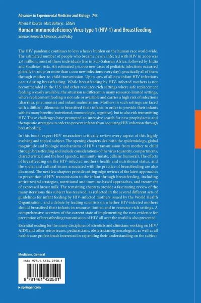 In this book, expert HIV researchers critically review every aspect of this highly evolving and topical subject. The opening chapters deal with the epidemiology, global magnitude and biologic mechanisms of HIV-1 transmission from mother to child through breastfeeding and include considerations of the virus (quantity, compartments, characteristics) and the host (genetic, immunity-innate, cellular, humoral). The effects of breastfeeding on the HIV-infected mother's health and nutritional status, and the social and cultural issues associated with the practice of breastfeeding are also discussed. The next few chapters provide cutting-edge reviews of the latest approaches to prevention of HIV transmission to the infant through breastfeeding, including antiretroviral strategies, nutritional and immune-based approaches, and treatment of expressed breast milk. The remaining chapters provide a fascinating review of the many iterations this subject has received, as reflected in the several different sets of guidelines for infant feeding by HIV-infected mothers issued by the World Health Organization, and a debate by leading scientists on whether HIV-infected mothers should breastfeed their infants-in resource-limited and in resource-rich settings. A comprehensive overview of the current state of implementing the new evidence for prevention of breastfeeding transmission of HIV all over the world is also presented.