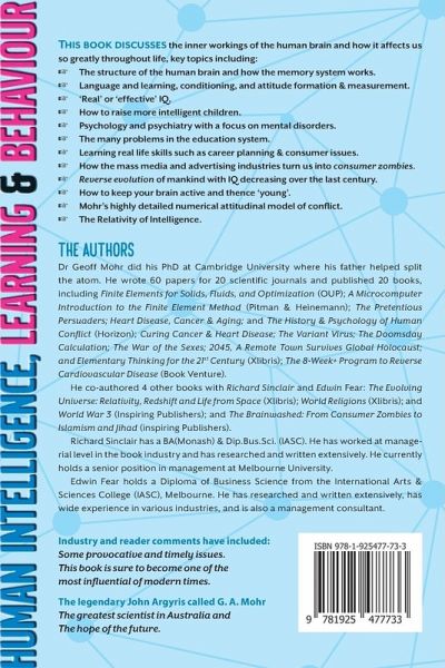 This Book Dr Geoff Mohr PhD discusses the inner workings of the human brain and how it affects us so greatly throughout life, key topics including: ¿ The structure of the human brain and how the memory system works. ¿ Language and learning, conditioning, and attitude formation & measurement. ¿ ‘Real’ or ‘effective’ IQ. ¿ How to raise more intelligent children. ¿ Psychology and psychiatry with a focus on mental disorders. ¿ The many problems in the education system. ¿ Learning real life skills such as career planning & consumer issues. ¿ How the mass media and advertising industries turn us into consumer zombies. ¿ Reverse evolution of mankind with IQ decreasing over the last century. ¿ How to keep your brain active and thence ‘young’. ¿ Mohr’s highly detailed numerical attitudinal model of conflict. ¿ The Relativity of Intelligence.
