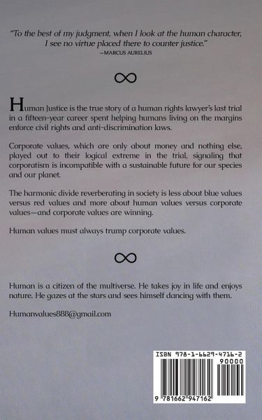 Human Justice tells the compelling true story of a human rights lawyer's last trial in a 15-year career spent helping people living on the margins enforce civil rights and anti-discrimination laws. Corporate values, which are only about money and nothing else, played out to their logical extreme in the case, signaling that corporatism is incompatible with a sustainable future for our species and our planet. "This was my last trial before leaving the law to focus on leading with my heart," writes the author, who wrote the book in the four months between the end of the trial and the tribunal's verdict. "I knew before it was over that this was my last trial, as I didn't want to put another human through the abuse the corporate side piled on my friend and client." The harmonic divide reverberating in our society is less about blue values versus red values and more about human values versus corporate values-and the corporate side is winning. Through storytelling that reads like fiction, the author sheds light on a justice system dominated by corporations with an infinite appetite for natural resources and human souls, and calls for reorganizing society around empathy, sustainability, and love. As the author writes, human values must always trump corporate values. With its timely message of unity and community, Human Justice is a spark igniting a shift in society from corporatism to consciousness. A candid portrait of a justice system where corporate values reign supreme, Human Justice is a cathartic read for legal practitioners, and a guide for readers interested in how justice really works.