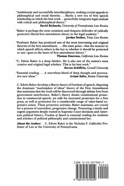 This is a paperback reprint of an OUP/USA hardcover published in September 1989. To date the predominant rationale for freedom of speech has been the "marketplace of ideas" theory, which holds that the truth will be discovered only through debate free from government interference. In Human Liberty and Freedom of Speech, Baker critiques the assumptions underlying the various versions of this theory and develops a liberty theory which, he argues, has deep roots in Supreme Court decisions and our political history. Baker contends that a liberty theory is more philosophically sound, more interpretatively persuasive and more protective of speech than the judically and intellectual dominant market place of ideas theory.