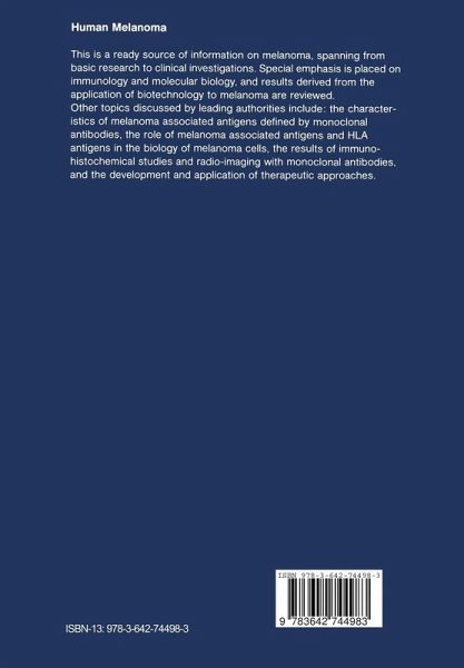 Biology.- Growth Regulation in Normal and Malignant Melanocytes.- Gangliosides in Melanoma.- Analysis of Human Melanosome-Specific Antigen in Malignant Melanoma and Its Precursors.- Role of Melanosomal Antigen in Melanoma Regression and Depigmentation.- Immunology and Molecular Biology.- Cross-Species Melanoma Antigen.- Melanoma-Associated Antigens in Xiphophorus Fish.- Characterization of p97, a Human Melanoma-Associated Antigen, and Development of a Recombinant Vaccine for Melanoma.- Molecular Cloning of Genes That Specify Melanoma-Associated Antigens.- Melanoma Antigens and Their Association with Malignant Transformation and Tumor Progression.- Antibody-Mediated Modulation of Melanoma-Associated Antigens: Access of Monoclonal Antibodies into Melanoma Cells and Melanoma Tissue.- The Central Role of Cell Surface-Deposited C3b in Complement Susceptibility of Human Melanoma Cells.- Second Generation Monoclonal Antibodies to a Human Melanoma-Associated Proteoglycan.- Immunobiology of Ocular Malignant Melanoma.- Immunobiology of the Regional Lymph Nodes in Cutaneous Malignant Melanoma.- HLA Class II Antigens on Melanoma Cells.- HLA Class II Molecules: Form and Function in Melanocytic Tumor Progression.- Clinical and Pathological Aspects.- Clinical and Immunohistological Features of Uveal Melanomas.- The Familial Atypical Multiple Mole Melanoma Syndrome and Visceral Cancer.- Immunopathology of Melanoma with Monoclonal Antibodies.- Changes in the Tumor-Associated Inflammatory Infiltrates in the Course of Local and Systemic Progression of Cutaneous Melanoma.- Clinical Implications of Human Melanoma-Associated Antigens.- Prognostic Factors for Cutaneous Melanoma.- Immunoscintigraphy.- Clinical Pharmacology Studies with Murine Antimelanoma Monoclonal Antibodies.- Radioimaging of Melanoma with 99Tcm-labeled Monoclonal Antibodies.- Radioimaging in Patients with Melanoma.- Radioimmunoscintigraphy of Ocular Melanomas.- Monoclonal Antibodies as Immunomodulating Agents in the Treatment of Melanoma.- Therapy.- Immunotherapy of Melanoma with Monoclonal Antibody-Drug Conjugates.- Immunotoxins to a Human Melanoma-Associated Proteoglycan: Progress Towards the Second Generation.- Preclinical Development of Monoclonal Antibody Conjugates for Site-directed Therapy of Human Malignant Melanoma.- Antimelanoma Antibodies for Therapy.- Therapy of Neuroectodermal Tumors with Monoclonal Antibodies.- Active Specific and Passive Immunotherapy of Melanoma: Clinical and Experimental Investigations with Murine Monoclonal Antibodies.- Immunoregulation and Active Specific Immunization in Cancer Treatment.- Vaccine Immunotherapy of Melanoma.- Surgery and Melanoma.- Surgery of Primary Melanoma.