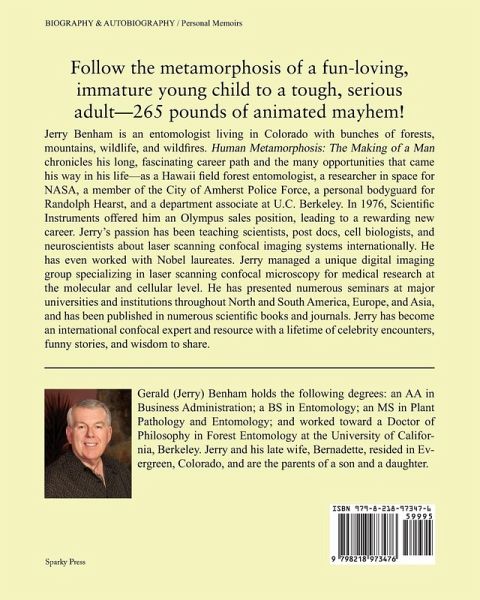 Jerry Benham is an entomologist living in Colorado with bunches of forests, mountains, wildlife, and wildfires. Human Metamorphosis: The Making of a Man chronicles his long, fascinating career path and the many opportunities that came his way in his life-as a Hawaii field forest entomologist, a researcher in space for NASA, a member of the City of Amherst Police Force, a personal bodyguard for Randolph Hearst, and a department associate at U.C. Berkeley. In 1976, Scientific Instruments offered him an Olympus sales position, leading to a rewarding new career. Jerry's passion has been teaching scientists, post docs, cell biologists, and neuroscientists about laser scanning confocal imaging systems internationally. He has even worked with Nobel laureates. Jerry managed a unique digital imaging group specializing in laser scanning confocal microscopy for medical research at the molecular and cellular level. He has presented numerous seminars at major universities and institutions throughout North and South America, Europe, and Asia, and has been published in numerous scientific books and journals. Jerry has become an international confocal expert and resource with a lifetime of celebrity encounters, funny stories, and wisdom to share.