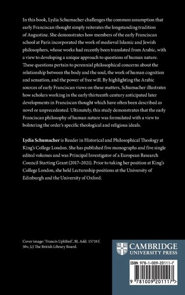 "In this book, Lydia Schumacher challenges the common assumption that early Franciscan thought simply reiterates the longstanding tradition of Augustine. She demonstrates how scholars from this tradition incorporated the work of Islamic and Jewish philosophers, whose works had recently been translated from Arabic, with a view to developing a unique approach to questions of human nature. These questions pertain to perennial philosophical concerns about the relationship between the body and the soul, the work of human cognition and sensation, and the power of free will. By highlighting the Arabic sources of early Franciscan views on these matters, Schumacher illustrates how scholars working in the early thirteenth century anticipated later developments in Franciscan thought which have often been described as novel or unprecedented. Above all, her study demonstrates that the early Franciscan philosophy of human nature was formulated with a view to bolstering the order's specific theological and religious ideals"--