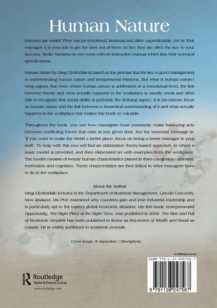 Humans are weird! They can be emotional, irrational and often unpredictable, yet as their manager, it is your job to get the best out of them. In fact they are often the key to your success. Sadly, humans do not come with an instruction manual which lists their technical specifications. Human Nature by Greg Clydesdale is based on the premise that the key to good management is understanding human nature and interpersonal relations. But what is human nature? Greg argues that even where human nature is addressed at a conceptual level; the link between theory and what actually happens in the workplace is usually weak and often fails to recognize that social ability is probably the defining aspect. It is his intense focus on human nature and the link between a theoretical understanding of it and what actually happens in the workplace that makes this book so valuable. Throughout the book, you see how managers must constantly make balancing acts between conflicting forces that exist at any given time. But the essential message is: 'If you want to make the World a better place, focus on being a better manager to your staff'. To help with this you will find an elaboration theory-based approach, in which a basic model is provided, and then elaborated on with examples from the work-place. The model consists of twenty human characteristics placed in three categories - emotion, motivation and cognition. These characteristics are then linked to what managers have to do in the workplace.