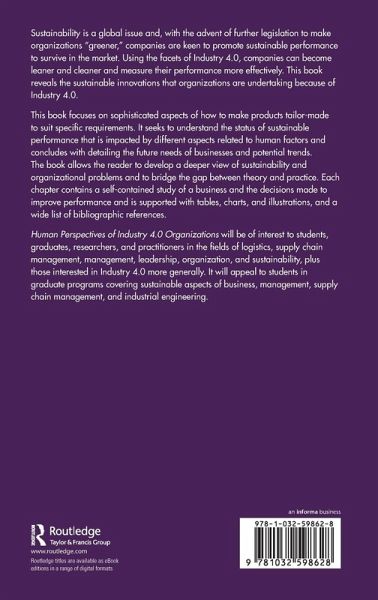 Human Perspectives of Industry 4.0 Organizations will be of interest to students, graduates, researchers, and practitioners in the fields of logistics, supply chain management, management, leadership, organization, and sustainability, plus those interested in Industry 4.0 more generally. It will appeal to students in graduate programs covering sustainable aspects of business, management, supply chain management, and industrial engineering.