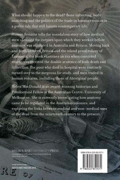 What should happen to the dead? Bone collecting, body snatching and the politics of the trade in human remains is a gothic tale that still haunts contemporary life. Human Remains tells the scandalous story of how medical men obtained the corpses upon which they worked before anatomy was regulated in Australia and Britain. Moving back and forth between Britain and the island penal colony of Tasmania, the book examines an era when convicted murderers received the double sentence of both death and dissection, the poor who died in hospital were routinely turned over to the surgeon for study, and great men traded in human remains, including those of Aboriginal people.