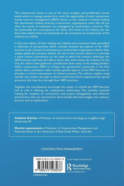 The construction sector is one of the most complex and problematic arenas within which to manage people. As a result, the applicability of much mainstream human resource management (HRM) theory to this industry is limited. Indeed, the operational realities faced by construction organizations mean that all too often the needs of employees are subjugated by performance concerns. This has potentially dire consequences for those who work in the industry, for the firms that employ them and ultimately, for the prosperity and productivity of the industry as a whole. In this new edition of their leading text, Andrew Dainty and Martin Loosemore have assembled a collection of perspectives which critically examine key aspects of the HRM function in the context of contemporary construction organizations. Rather than simply update the previous edition, the aim of this second edition is to provide a more critical commentary on the ways in which the industry addresses the HRM function and how this affects those who work within the industry. To this end, the editors have gathered contributions from many of the leading thinkers within construction HRM to critique the perspectives presented in the first edition. Each contributor either tackles specific aspects of the HRM function, or provides a critical commentary on industry practice. The authors explain, using real-life case studies, the ways in which construction firms respond to the myriad pressures that they face through their HRM practices. Together the contributions encourage the reader to rethink the HRM function and its role in defining the employment relationship. This provides essential reading for students of construction and project management, and reflective practitioners who are interested in theoretically informed insights into industry practice and its implications. ¿