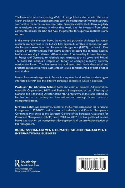 The European Union is expanding. Wide cultural, political and economic differences within the Union have a significant impact on the management of human resources, so crucial to the success of any enterprise. Businesses within the EU have regularly tried to re-evaluate the context in which they work, and for investors from other continents, notably the US and Asia, the potential for expensive mistakes is only too real. In this comprehensive new book, the varied and particular challenges for human resource management in the EU are fully explored. Written in conjunction with the European Association for Personal Management (EAPM), the book offers country-by-country analysis from native authors, assessing the contexts faced by businesses working in thirteen different states: from founding EU members like France and Germany, to relatively new entrants like Latvia and Poland. The book also includes a chapter on Turkey, an emerging economy currently outside the Union. The key issues are addressed from both theoretical and practical perspectives, whilst each chapter is also complimented by best practice case studies.
