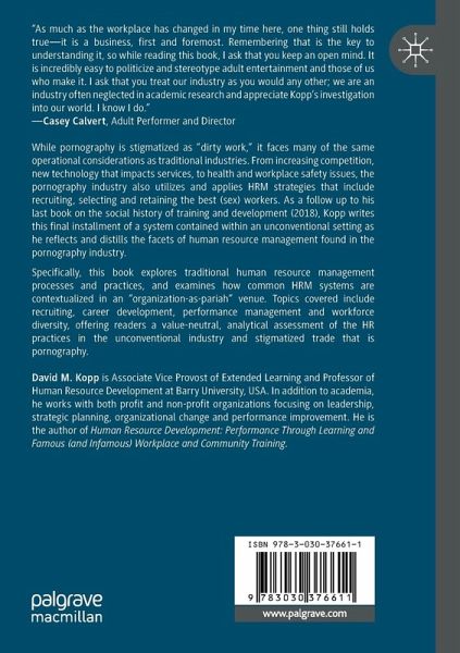 While pornography is stigmatized as "dirty work," it faces many of the same operational considerations as traditional industries. From increasing competition, new technology that impacts services, to health and workplace safety issues, the pornography industry also utilizes and applies HRM strategies that include recruiting, selecting and retaining the best (sex) workers. As a follow up to his last book on the social history of training and development (2018), Kopp writes this final installment of a system contained within an unconventional setting as he reflects and distills the facets of human resource management found in the pornography industry.