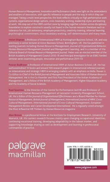 Helen Shipton is Professor of International HRM at Nottingham Business School, UK. Previously she has held positions as Senior Lecturer at Aston Business School, Birmingham, UK. Her research interests include HRM, innovation and performance and in particular, employee perceptions of HRM. She has published in leading journals including Human Resource Management, Journal of Organizational Behavior, Human Resource Management Journal and Management Learning, and is a member of the Editorial Board of Human Resource Management Journal. Helen is an elected member of the British Academy of Management Council and acted as the Principal Investigator for the ESRC-funded seminar series examining people, innovation and performance 2011-2013 that formed the basis of this book. Pawan Budhwar is Professor of International HRM at Aston Business School, UK. He has authored/edited 13 Books and around 100 research papers in international refereed journals in the areas of international and strategic HRM in emerging markets with an emphasis on India. Pawan is the Editor-in-Chief of British Journal of Management and Associate Editor of Human Resource Management. He is the Co-Founder and First Past President of Indian Academy of Management, and a Fellow of the British Academy of Management, Higher Education Academy and the Academy of Social Sciences. Paul Sparrow is the Director of the Centre for Performance-led HR and Professor of International Human Resource Management at Lancaster University Management School, UK. His research interests include cross-cultural and international HRM, HR strategy, performance-led HR and the employment relationship. He has consulted widely and is regularly voted amongst the Most Influential HR Thinkers by Human Resources magazine, listed from 2008- 2012 and in the Top 10 Most Influential for 2014-15. Alan Brown is a Professorial Fellow at the Institute for Employment Research, University of Warwick, UK. His current research, which has a strong international orientation, focuses mainly upon changing occupational identities, continuing vocational training, developing adaptability in the labour market, and supporting knowledge sharing and development and learning in professional communities of practice.