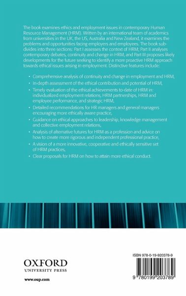 The book examines ethics and employment issues in contemporary Human Resource Management (HRM). Written by an international team of academics from universities in the UK, the US, Australia and New Zealand, it examines the problems and opportunities facing employers and employees. The book subdivides into three sections: Part I assesses the context of HRM; Part II analyses contemporary debates, continuity and change in HRM, and Part III proposes likely developments for the future seeking to identify a more proactive HRM approach towards ethical issues arising in employment. Distinctive features include: À Comprehensive analysis of continuity and change in employment and HRM, À In-depth assessment of the ethical contribution and potential of HRM, À Timely evaluation of the ethical achievements to-date of HRM in: individualized employment relations, HRM partnerships, HRM and employee performance, and strategic HRM, À Detailed recommendations for HR managers and general managers encouraging more ethically aware practice, À Guidance on ethical approaches to leadership, knowledge management and collective employment relations, À Analysis of alternative futures for HRM as a profession and advice on how to create more rigorous and independent professional practice, À A vision of a more innovative, cooperative and ethically sensitive set of HRM practices, À Clear proposals for HRM on how to attain more ethical conduct.
