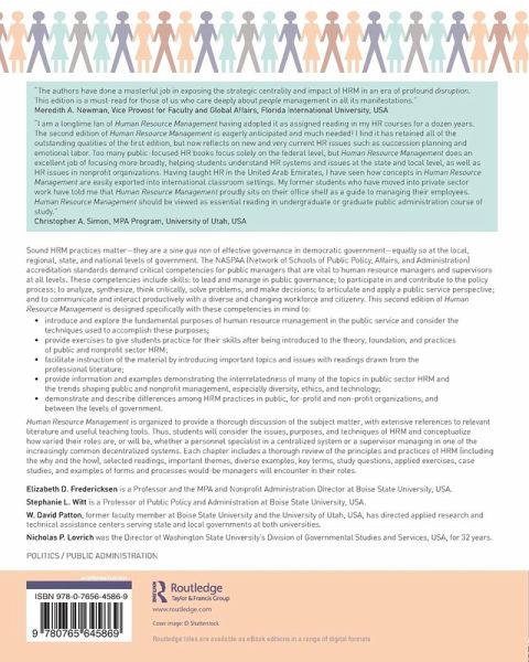 Sound HRM practices matter-they are a sine qua non of effective governance in democratic government-equally so at the local, regional, state and national levels of government. The NASPAA (Network of Schools of Public Policy, Affairs, and Administration) accreditation standards demand critical competencies for public managers that are vital to human resource managers and supervisors at all levels. These competencies include: skills to lead and manage in public governance; to participate in and contribute to the policy process; to analyze, synthesize, think critically, solve problems and make decisions; to articulate and apply a public service perspective; and to communicate and interact productively with a diverse and changing workforce and citizenry. This second edition of Human Resource Management is designed specifically with these competencies in mind to: Introduce and explore the fundamental purposes of human resource management in the public service and consider the techniques used to accomplish these purposes Provide exercises to give students practice for their skills after being introduced to the theory, foundation, and practices of public and nonprofit sector HRM Facilitate instruction of the material by introducing important topics and issues with readings drawn from the professional literature Provide information and examples demonstrating the interrelatedness of many of the topics in public sector HRM and the trends shaping public and nonprofit management, especially diversity, ethics, and technology. Demonstrate and describe differences among HRM practices in public, for-profit and nonprofit organizations, and between the levels of government. Human Resource Management is organized to provide a thorough discussion of the subject matter with extensive references to relevant literature and useful teaching tools. Thus, students will consider the issues, purposes, and techniques of HRM and conceptualize how varied their roles are, or will be, whether a personnel specialist in a centralized system or a supervisor managing in one of the increasingly common decentralized systems. Each chapter includes a thorough review of the principles and practices of HRM (including the why and the how), selected readings, important themes, diverse examples, key terms, study questions, applied exercises, case studies, and examples of forms and processes would-be managers will encounter in their roles.¿