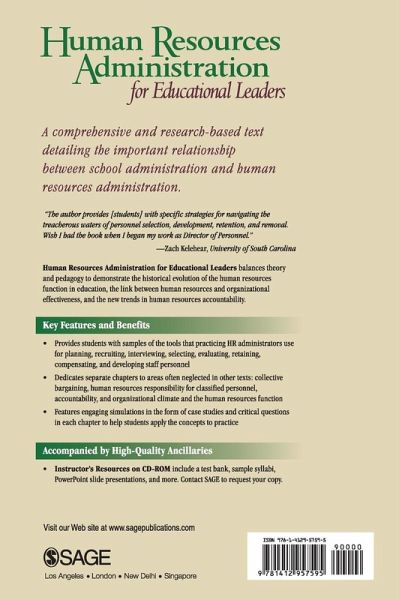 A comprehensive and research-based text detailing the important relationship between school administration and human resources administration. "The author provides [students] with specific strategies for navigating the treacherous waters of personnel selection, development, retention, and removal. I wish I had the book when I began my work as Director of Personnel." -Zach Kelehear University of South Carolina Human Resources Administration for Educational Leaders balances theory and pedagogy to demonstrate the historical evolution of the human resources function in education, the link between human resources and organizational effectiveness, and the new trends in human resources accountability. Key Features and Benefits: * Provides students with samples of the tools that practicing HR administrators use for planning, recruiting, interviewing, selecting, evaluating, compensating, and developing staff personnel * Dedicates separate chapters to areas often neglected in other texts: collective bargaining, human resources responsibility for classified personnel, accountability, and organizational climate and the human resources function * Features engaging simulations in the form of case studies and critical questions to help students apply the concepts to practice Accompanied by High-Quality Ancillaries Instructors' Resources on CD-ROM includes a test bank, sample syllabi, PowerPoint slide presentations, and more. Contact SAGE to request your copy. Meet the author!