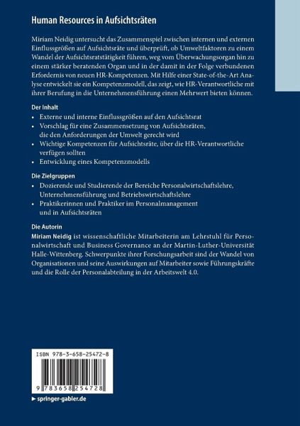 Miriam Neidig untersucht das Zusammenspiel zwischen internen und externen Einflussgrößen auf Aufsichtsräte und überprüft, ob Umweltfaktoren zu einem Wandel der Aufsichtsratstätigkeit führen, weg vom Überwachungsorgan hin zu einem stärker beratenden Organ und in der damit in der Folge verbundenen Erfordernis von neuen HR-Kompetenzen. Mit Hilfe einer State-of-the-Art Analyse entwickelt sie ein Kompetenzmodell, das zeigt, wie HR-Verantwortliche mit ihrer Berufung in die Unternehmensführung einen Mehrwert bieten können.