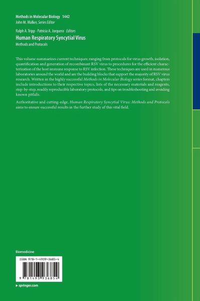 Thisvolume summarizes current techniques; ranging from protocols for virus growth,isolation, quantification and generation of recombinant RSV virus to proceduresfor the efficient characterization of the host immune response to RSVinfection. These techniques are used in numerous laboratories around the worldand are the building blocks that support the majority of RSV virus research. Written in the highly successful Methods in MolecularBiology series format, chapters include introductions to their respectivetopics, lists of the necessary materials and reagents, step-by-step, readilyreproducible laboratory protocols, and tips on troubleshooting and avoidingknown pitfalls.