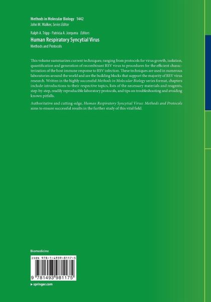 Thisvolume summarizes current techniques; ranging from protocols for virus growth,isolation, quantification and generation of recombinant RSV virus to proceduresfor the efficient characterization of the host immune response to RSVinfection. These techniques are used in numerous laboratories around the worldand are the building blocks that support the majority of RSV virus research. Written in the highly successful Methods in MolecularBiology series format, chapters include introductions to their respectivetopics, lists of the necessary materials and reagents, step-by-step, readilyreproducible laboratory protocols, and tips on troubleshooting and avoidingknown pitfalls.
