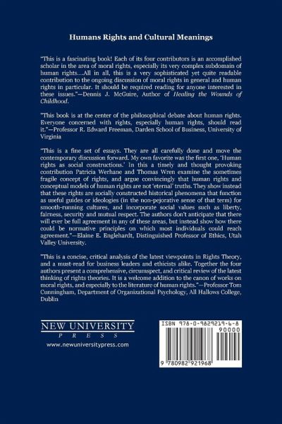 Each of the four contributors to Human Rights and Cultural Meanings is a scholar in the area of moral rights, especially its very complex subdomain of human rights. From their different perspectives they clarify the ongoing, socially constructed character of rights theory in general as well as its specific contemporary version, "human rights." The first chapter, "Human rights as social constructions" by Patricia Werhane and Thomas Wren, focuses directly on the socially constructed character of the concept of rights, especially the contemporary notion of human rights. Abstract models of human rights are not eternal truths but rather historical phenomena that provide more or less useful conceptual schemes for generating general principles of fairness, liberty, mutual respect, and security. In the next chapter, "Educating for human rights consciousness," education scholar Michelle Bellino demonstrates the inherently unfinished character of human rights discourse. She presents a remarkable ethnographic study of the reception by Guatemalan students of a human rights-based educational program established in the aftermath of their country's 36-year civil war. Her study includes a rich typology in which young people exhibit denial of the normative claims of human rights, skepticism about whether it can be effectively practiced in their own country, and a sense of empowerment. In contrast, David Ozar's "Human rights and the rest of us" uses the surgical tools of contemporary analytical philosophy to reconstruct the claim that human rights claims are only "manifestos" addressed to everyone in principle and no one in particular. He demonstrates that the human rights claims of distant others are addressed to all of us, albeit in many different ways. The final chapter, Wren's "The birth of rights talk," traces the transition from the ancient notion of objective rightness to the modern notion of rights as powers. He argues that the transformation took place in the high Middle Ages, as part of a larger social transformation that included new person-centered modes of discourse for interpreting sacred and classical texts as well as for rough and ready litigating.