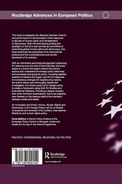 This book investigates the disparity between rhetoric and performance in the European Union response to abuses of human rights and transgression of democracy. With the Arab spring putting the spotlight on the EU's self-portrait as committed to promoting global human rights and democracy, this book examines the paradoxes of its international posture and the inconsistencies and double standards of its policies. With an informative and empirical approach examining EU relations since the end of the Cold War, this book seeks to uncover the reasons behind the Union's actions and understand the foreign policy dilemmas and processes that guide its action. Including detailed analysis of Ukraine and Egypt, and the EU response to momentous changes for neighbouring nations, the author draws upon thoroughly-researched investigation into twenty years of EU foreign policy to create a framework using both EU Studies and International Relations. Providing a deeper analysis than other dominant explanations, this book presents new theories on the reasons behind the mismatch between words and deeds. An invaluable and timely volume, Human Rights and Democracy in EU Foreign Policy will be of interest to students and scholars of EU politics, International Relations and human rights policy.