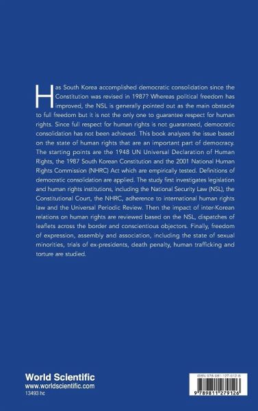 Has South Korea accomplished democratic consolidation since the Constitution was revised in 1987? Whereas political freedom has improved, the NSL is generally pointed out as the main obstacle to full freedom but it is not the only one to guarantee respect for human rights. Since full respect for human rights is not guaranteed, democratic consolidation has not been achieved. This book analyzes the issue based on the state of human rights that are an important part of democracy. The starting points are the 1948 UN Universal Declaration of Human Rights, the 1987 South Korean Constitution and the 2001 National Human Rights Commission (NHRC) Act which are empirically tested. Definitions of democratic consolidation are applied. The study first investiga- tes legislation and human rights institutions, including the National Security Law (NSL), the Con-stitutional Court, the NHRC, adherence to international human rights law and the Universal Periodic Review. Then the impact of inter-Korean relations on human rights are reviewed based on the NSL, dispatches of leaflets across the border and conscientious objectors. Finally, freedom of expression, assembly and association, including the state of sexual minorities, trials of ex-presidents, death penalty, human trafficking and torture are studied.