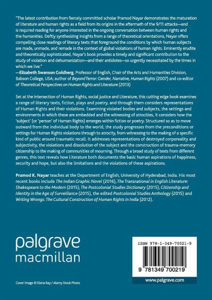 Set at the intersection of Human Rights, social justice and Literature, this cutting edge book examines a range of literary texts, fiction, plays and poetry, and through them considers representations of Human Rights and their violations. Examining violated bodies and subjects, the settings and environments in which these are embedded and the witnessing of atrocities, it considers how the 'subject' (or 'person' of Human Rights) emerges within fiction or poetry. Structured so as to move outward from the individual body to the world, the study progresses from the preconditions or settings for Human Rights violations through to atrocity, from witnessing to the making of a specific kind of public around traumatic recall. It addresses representations of destroyed corporeality and subjectivity, the violations and dissolution of the subject and the construction of trauma-memory citizenship to the making of communities of mourning. Through a broad study of texts from different genres, this text reveals how Literature both documents the basic human aspirations of happiness, security and hope, but also the limitations and the violations of these aspirations.