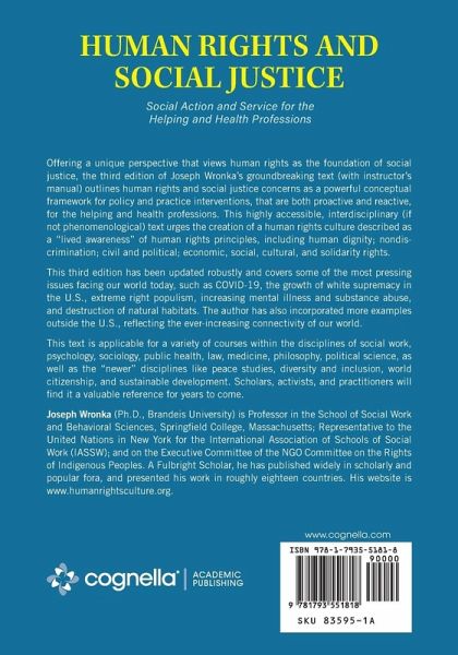 Offering a unique perspective that views human rights as the foundation of social justice, the third edition of Joseph Wronka's groundbreaking text (with instructor's manual) outlines human rights and social justice concerns as a powerful conceptual framework for policy and practice interventions, that are both proactive and reactive, for the helping and health professions. This highly accessible, interdisciplinary (if not phenomenological) text urges the creation of a human rights culture described as a "lived awareness" of human rights principles, including human dignity; nondiscrimination; civil and political; economic, social, cultural, and solidarity rights. This third edition has been updated robustly and covers some of the most pressing issues facing our world today, such as COVID-19, the growth of white supremacy in the U.S., extreme right populism, increasing mental illness and substance abuse, and destruction of natural habitats. The author has also incorporated more examples outside the U.S., reflecting the ever-increasing connectivity of our world. This text is applicable for a variety of courses within the disciplines of social work, psychology, sociology, public health, law, medicine, philosophy, political science, as well as the "newer" disciplines like peace studies, diversity and inclusion, world citizenship, and sustainable development. Scholars, activists, and practitioners will find it a valuable reference for years to come.
